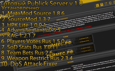 Установленно: 1. MetaMod Source 1.8.6 2. SourceMod 1.3.7 3. HPK Lite 1.0.0.1 4. Advertisements 0.5.5 5. KAC 1.2.1.7 6. Players Votes Rus 1.5.0 7. SoD Stats Rus 1.0.11 8. Team Bets Rus 2.6 9. Weapon Restrict Rus 2.3.4 10. DoS Attack Fixer No steam эмулятор в архиве!